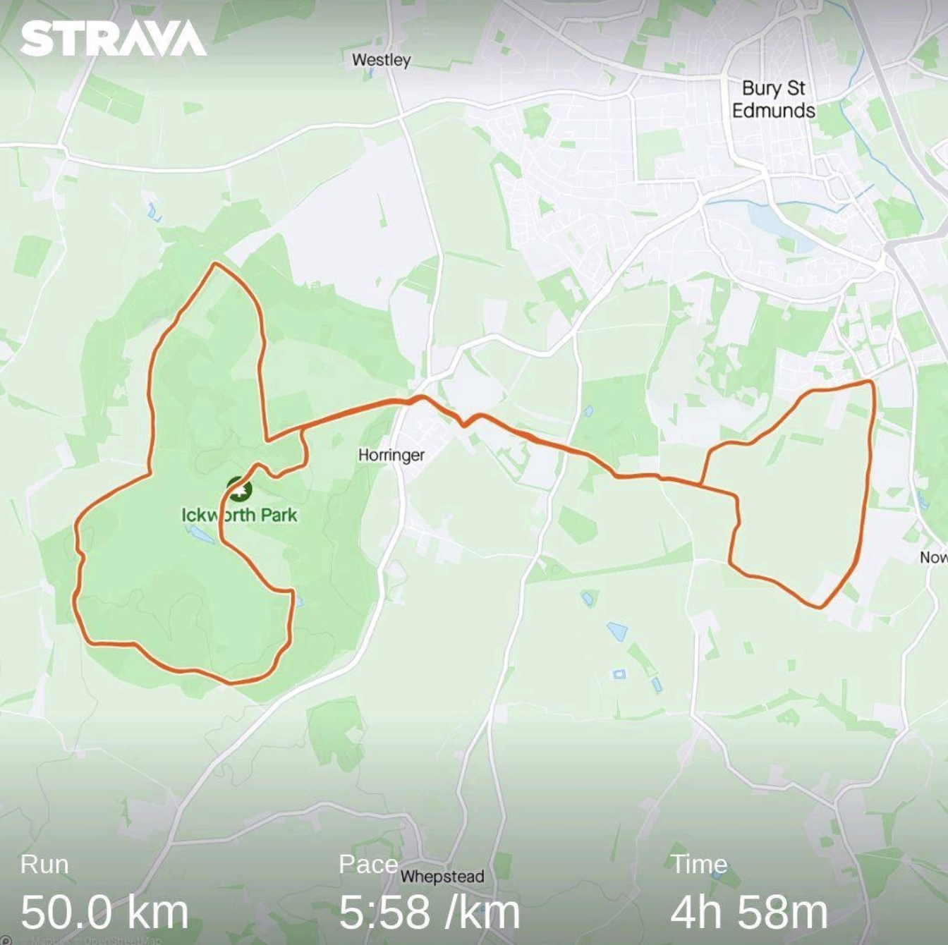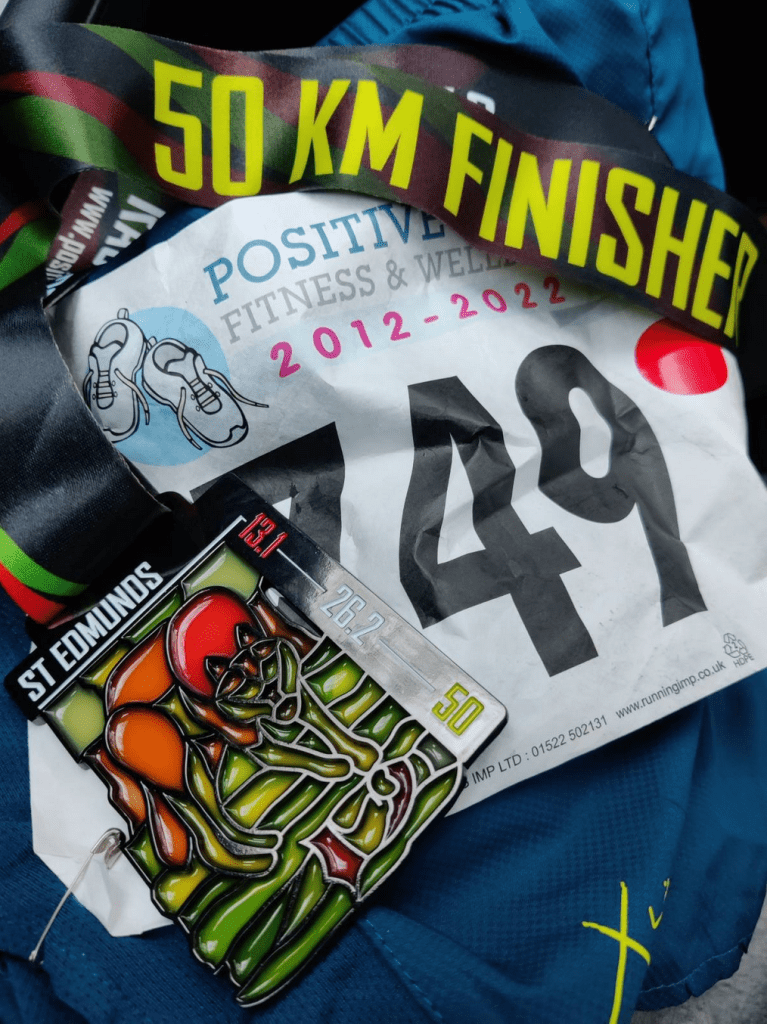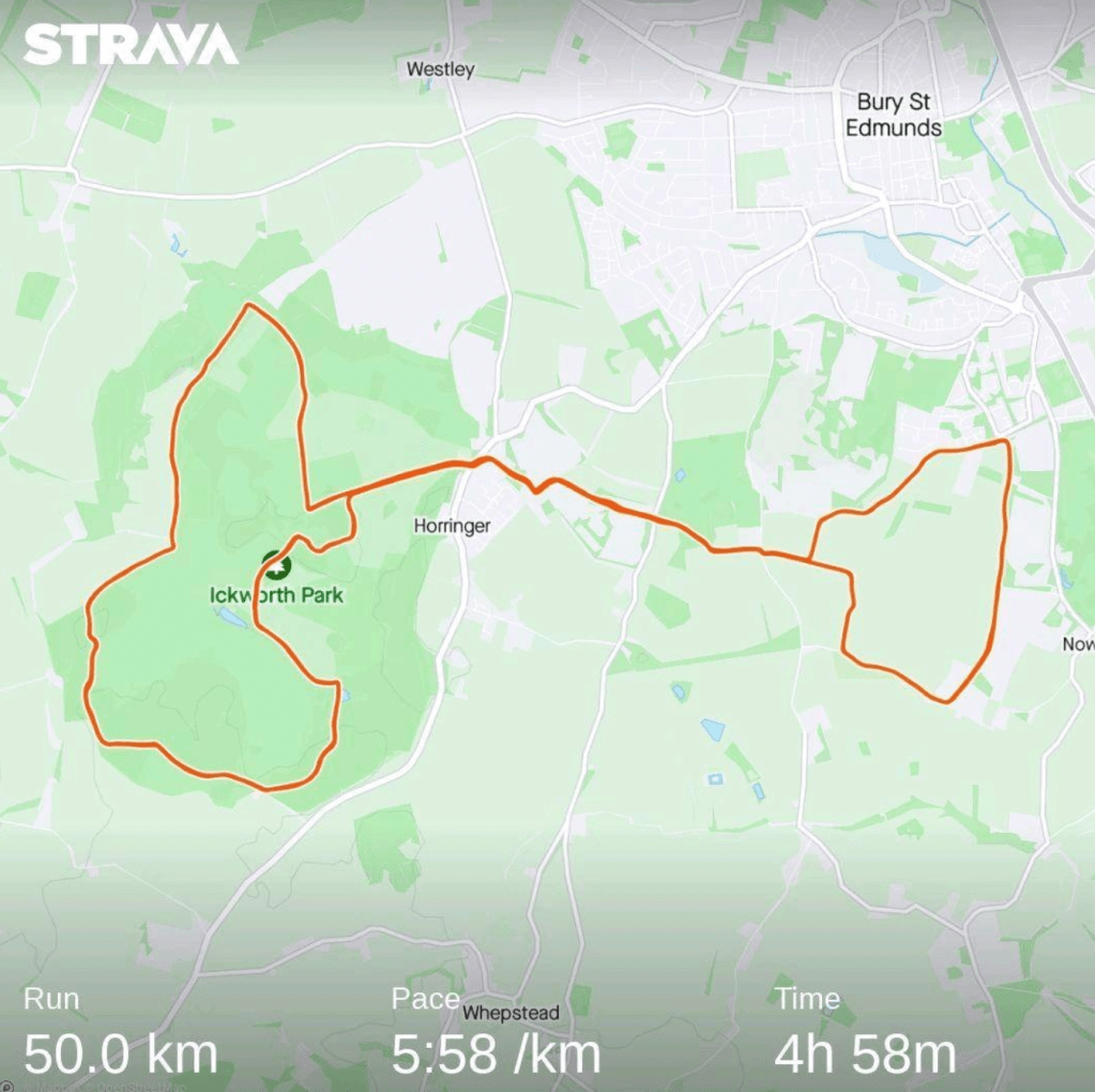At the end of the approximately 53 kilometres my quads and hips were very sore. But I did manage to get a 50k PB of 4 hours and 58 minutes.