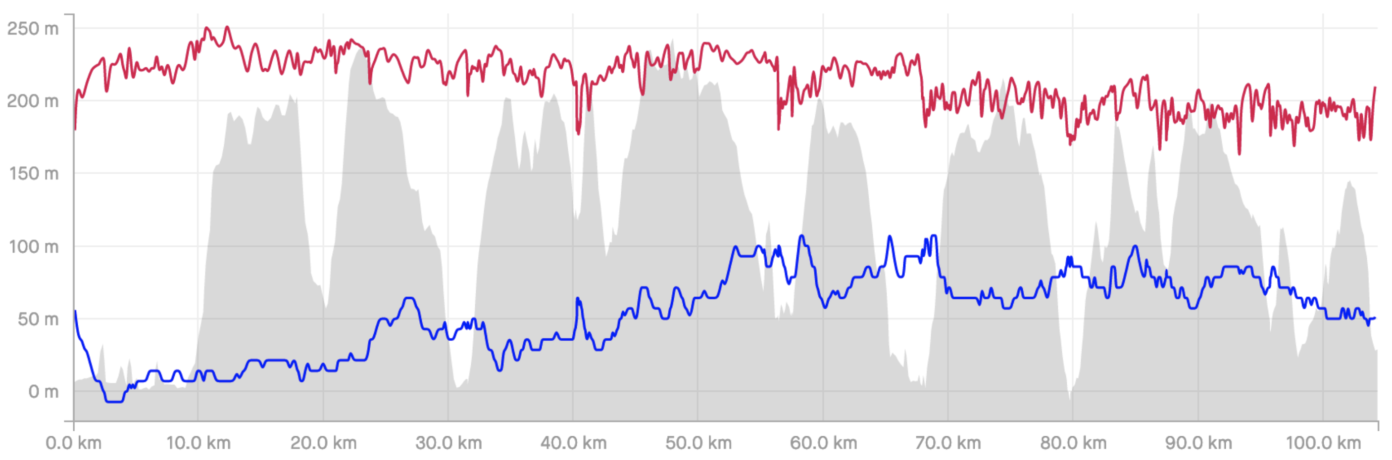 – The first couple of hours of running were relatively cool, but it wasn’t long before the sun was high in the sky with no cloud cover on very open trails. The temperature was forecast for highs of 21 degrees. However, my watch was recording up to 27 degrees (in the valleys in the middle of the day), with an average of 25 for the whole day. It felt very hot! Luckily, I did bring my Sahara cap which I was able to wet at a few of the aid stations.
