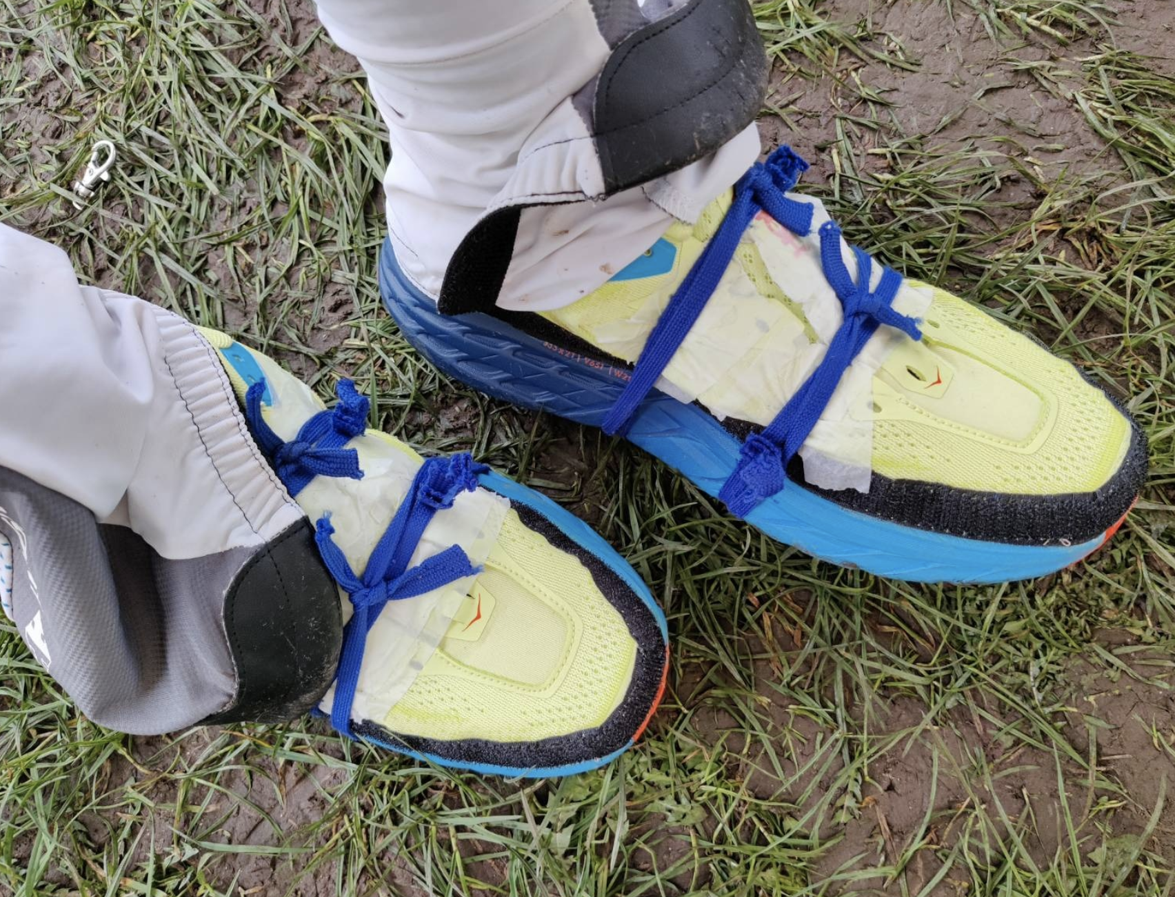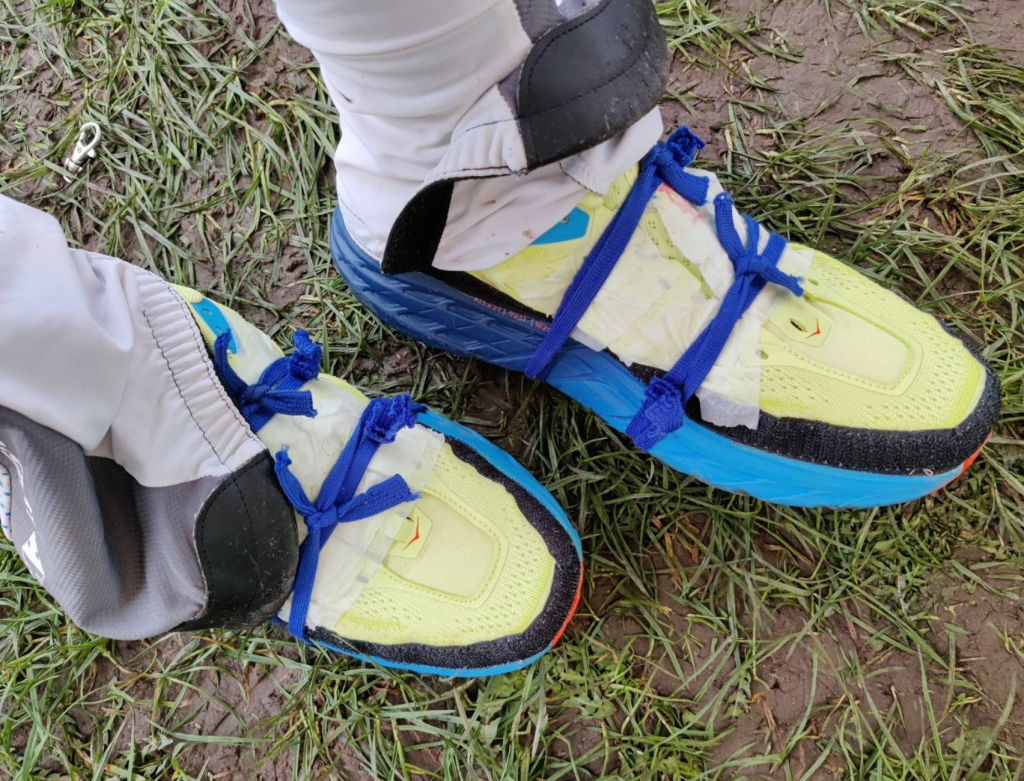 I managed to fashion some laces out of a couple of unused lanyards tied all the way around my shoes, so at least the shoes would stay on my feet, and so I ran the race. Slowly and carefully.